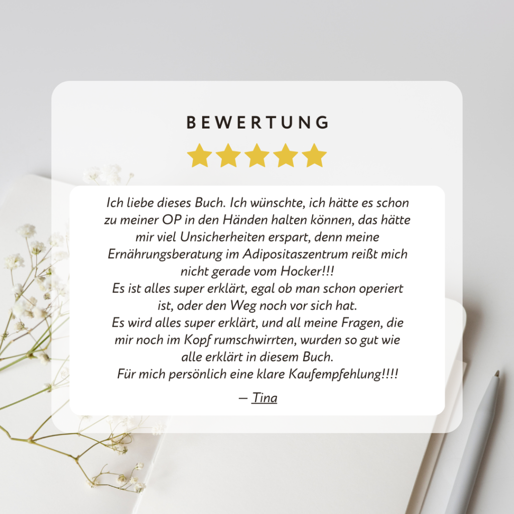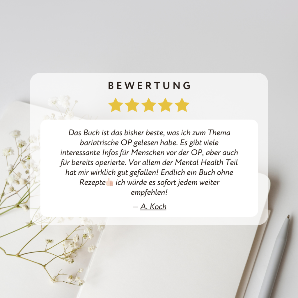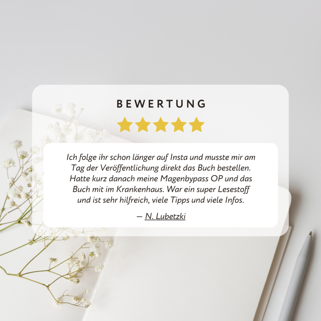Als erfahrene Expertin im Bereich der Magenverkleinerung und Betreuung von Patienten vor und nach der Operation teile ich in “Deine Magenverkleinerung” mein Fachwissen und meine persönlichen Erfahrungen. Von Ernährungsempfehlungen über Tipps zur mentalen Gesundheit bis hin zu bewährten Strategien für den Alltag – dieses Buch bietet einen ganzheitlichen Ansatz, um den Herausforderungen nach der Magenverkleinerung erfolgreich zu begegnen.